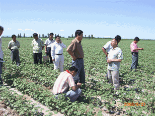圖3:公司技術(shù)員與農(nóng)六師共青團(tuán)在察看棉田 圖4:察看和豐縣私人農(nóng)場(chǎng)
