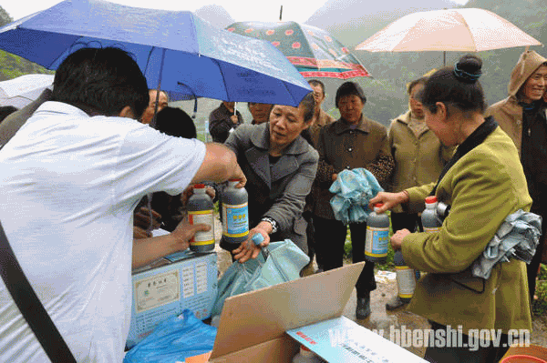 中國硒都網(wǎng)訊(記者 沈宏臣 通訊員 黃怡 王永?。?/span>5月3日,在土壤酸化調(diào)理劑發(fā)放現(xiàn)場,恩施市農(nóng)業(yè)技術(shù)推廣中心工作人員正在為三岔鄉(xiāng)農(nóng)民發(fā)放土壤酸化治理劑“施地佳”。
