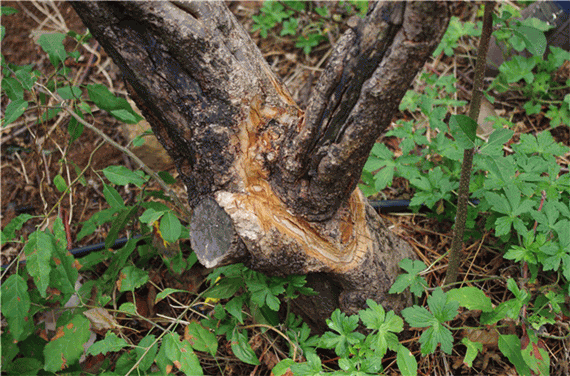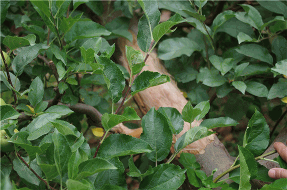 上圖為腐爛病導(dǎo)致這棵蘋果樹皮被刮掉大面積