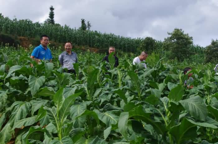 李總、云南省煙科院專家張曉海教授、麻栗坡縣煙草公司趙經(jīng)理在現(xiàn)場察看煙草長勢