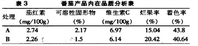 番茄品質試驗數據表明,茄紅素含量對照比處理要低0.48mg/l00g,可溶性固形物低0.67%,維生素C含量低0.83mg/100g,爛果率高5.38%。著色率低3.16%。