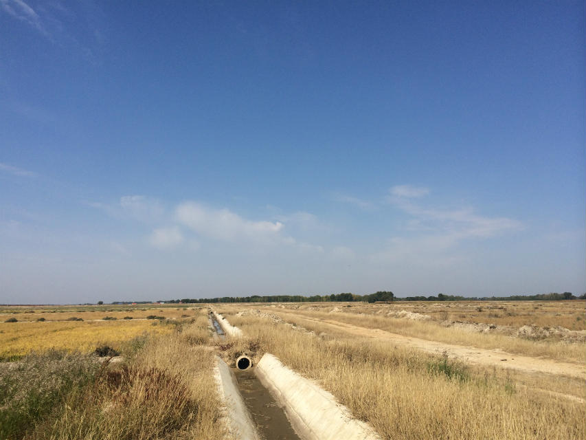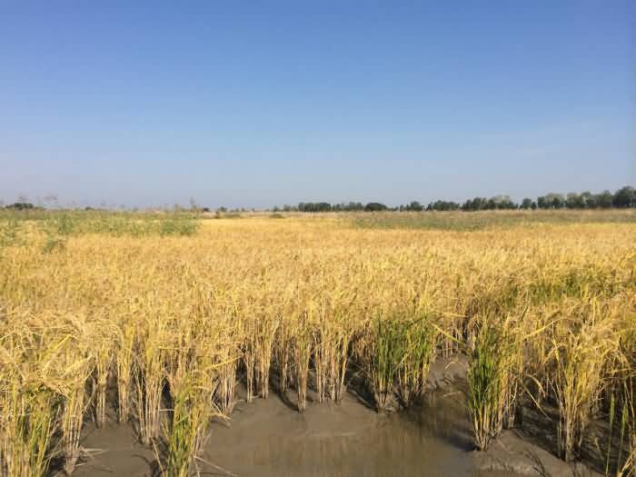 圖8:吉林省鎮(zhèn)賚縣騰輝公司新開墾鹽堿荒地使用“施地佳”土壤調(diào)理劑當(dāng)年成功,水渠左邊是使用了“施地佳” 土壤調(diào)理劑的金黃色稻子,水渠右邊的地里無收成