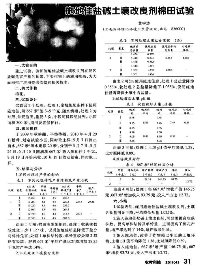 《農(nóng)村科技》2011年第4期 “施地佳” 鹽堿土壤改良劑棉田試驗