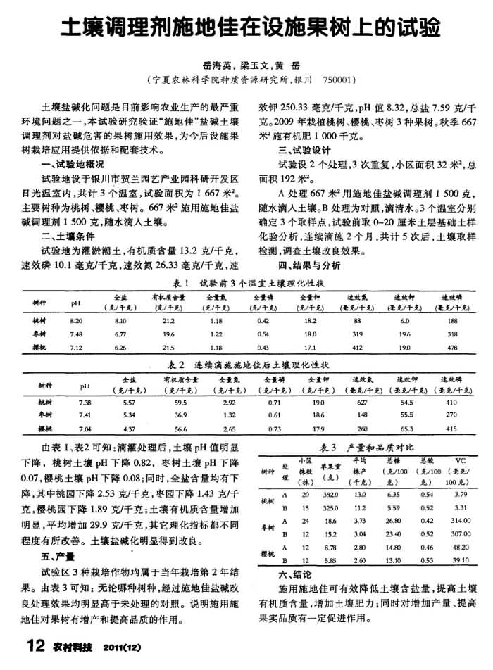 《農(nóng)村科技》2011年12期 土壤調(diào)理劑“施地佳”在設(shè)施果樹上的試驗(yàn)