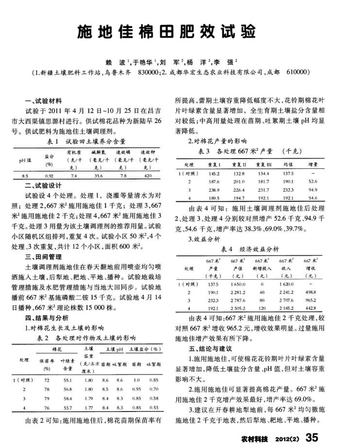 《農(nóng)村科技》2012年第2期 “施地佳”棉田試驗(yàn)