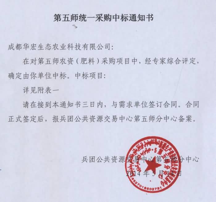 公司產(chǎn)品中標(biāo)新疆兵團(tuán)第五師農(nóng)資采購項(xiàng)目
