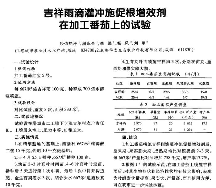 《農(nóng)村科技》2011年第1期 “吉祥雨”滴灌沖施促根增效劑在加工番茄上的試驗(yàn)