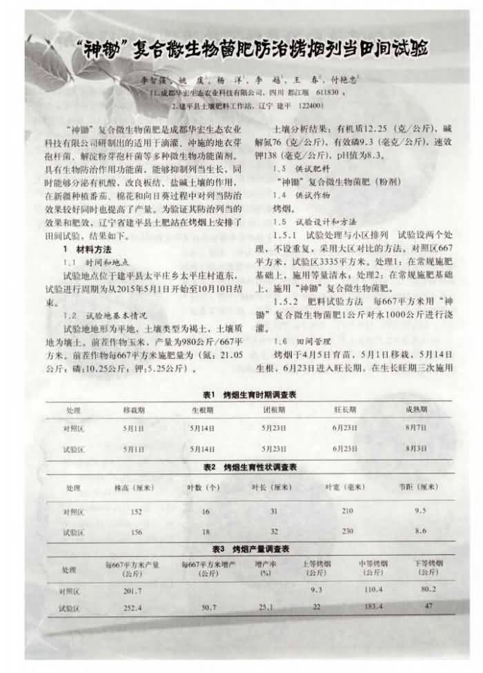《新農(nóng)業(yè)》2016年 第7期“神鋤”復(fù)合微生物菌肥防治烤煙列當(dāng)田間試驗(yàn)