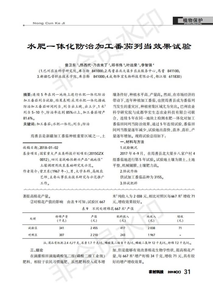 水肥一體化防治加工番茄列當效果試驗