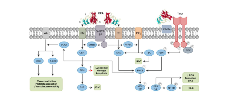 ③CPA中央環(huán)區(qū)域上的神經(jīng)節(jié)苷脂結(jié)合位點與細(xì)胞膜上的激活原肌球蛋白受體激酶A(TrkA)相互作用,使PDK1和PKCθ磷酸化,激活MEK/ERK信號傳導(dǎo)和NF-κB,形成活性氧(ROS)引起細(xì)胞氧化應(yīng)激、激活細(xì)胞凋亡機制,促進IL-8分泌,促進炎癥發(fā)生。