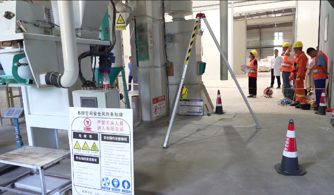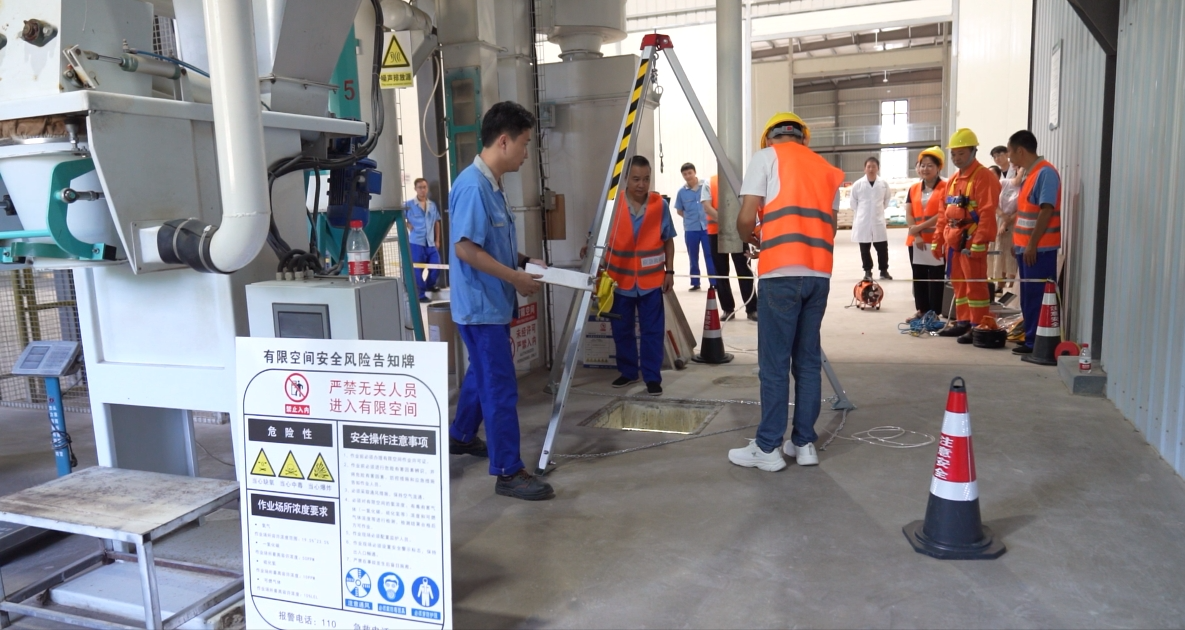 本次演練的有限空間位于混合型飼料添加劑生產車間的地下,現(xiàn)場作業(yè)組、檢測組、救援組、監(jiān)護組等參演人員,攜各類作業(yè)設備裝備按規(guī)范流程開展準備工作。