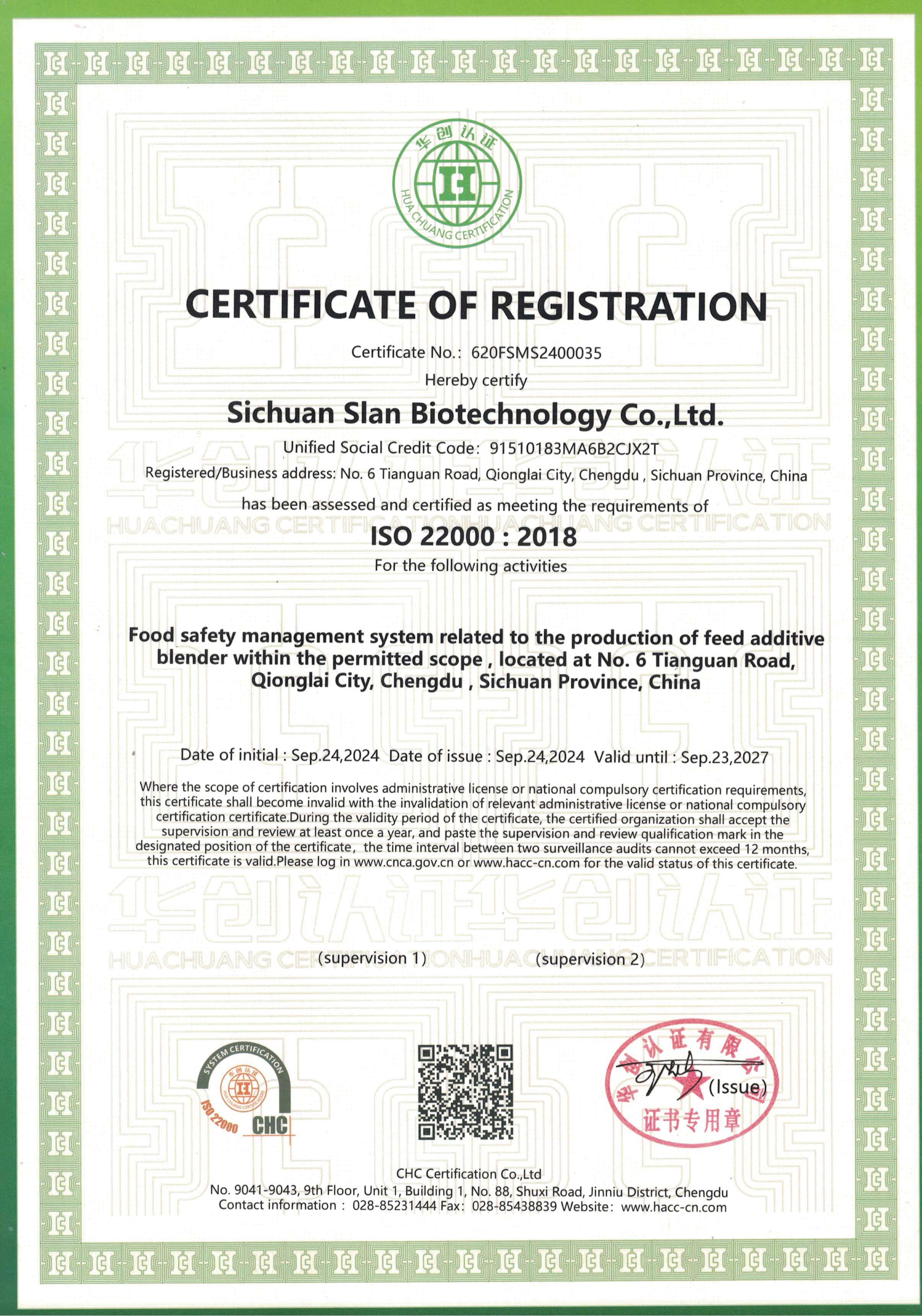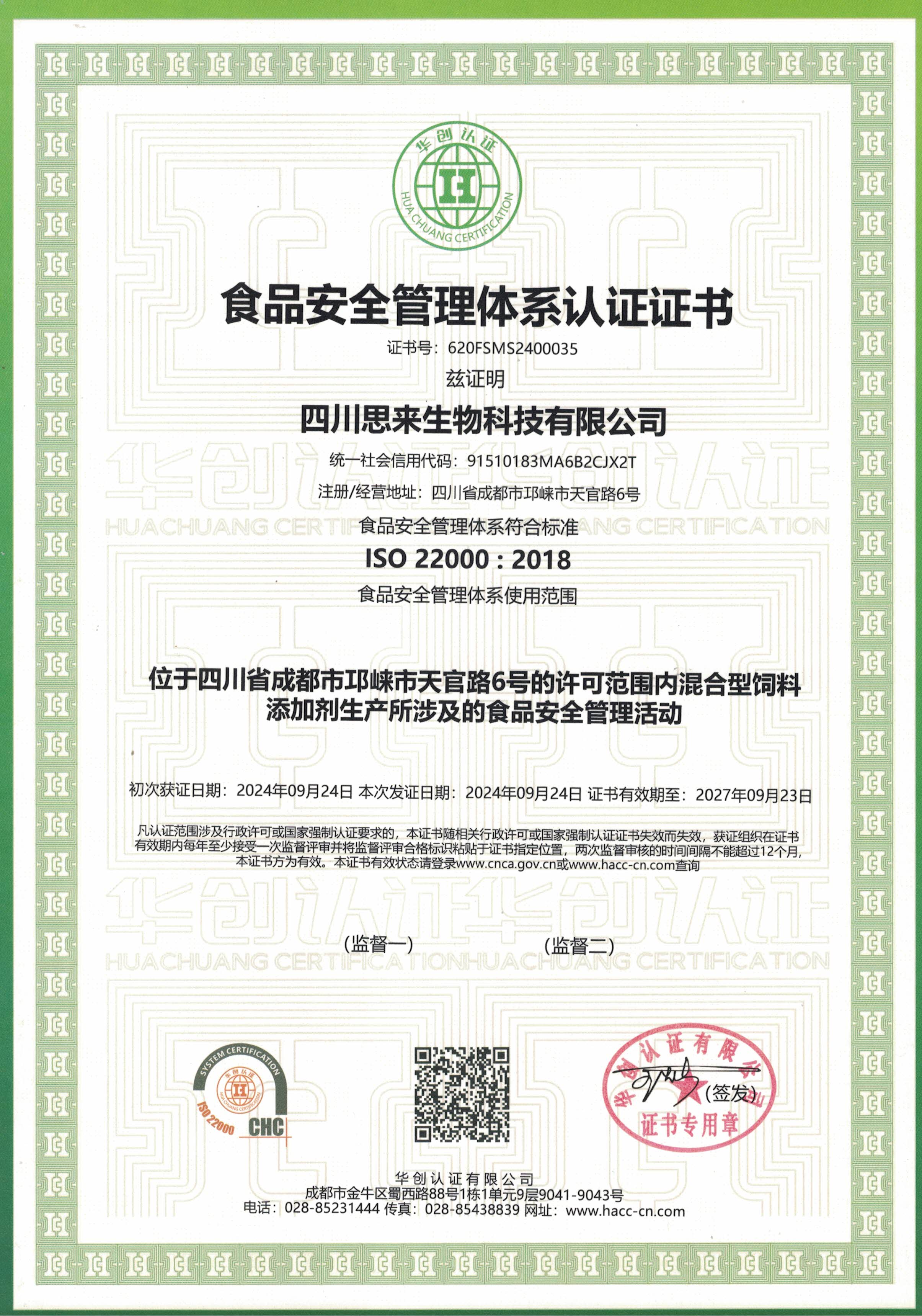 并于2024年9月24日為我司頒發(fā)了“食品安全管理體系認(rèn)證證書”