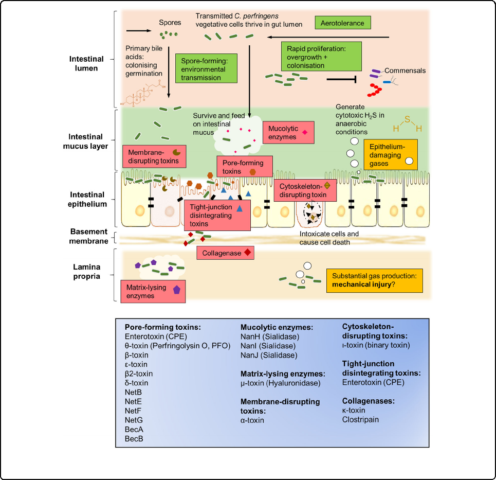 ■ 產(chǎn)氣莢膜梭菌能產(chǎn)生多種毒力因子(包括毒素和水解酶類),使其能快速生長、耐有氧環(huán)境、產(chǎn)生具有細(xì)胞毒性的硫化氫氣體,引起宿主組織和腸道毒性感染、氣性壞疽、腸毒血癥等疾病。