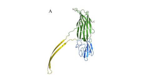 - NetB 單體約為0.18nm,包含3個主要結(jié)構(gòu)域,如圖示A:①β-sandwich:綠色,與單體寡聚化有關(guān);②stem:黃色,疏水跨膜結(jié)構(gòu),插入細(xì)胞膜;③rim:藍色,與細(xì)胞膜結(jié)合,參與毒素滲透進入細(xì)胞膜;相較于其他β-PFT,缺失4個氨基酸,推測其在細(xì)胞膜上的受體與其他不同。